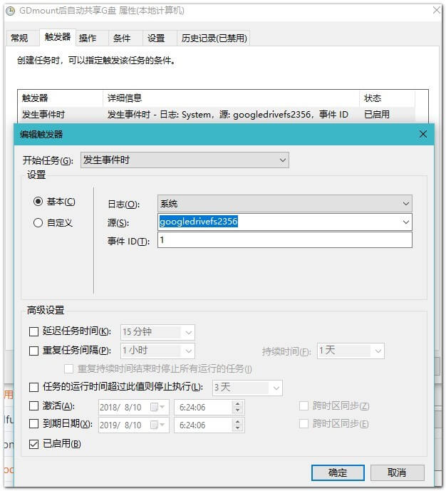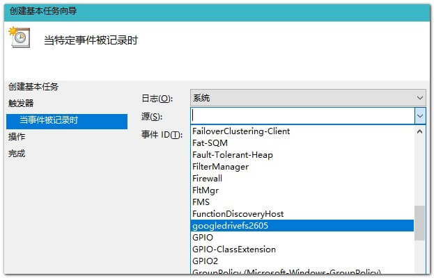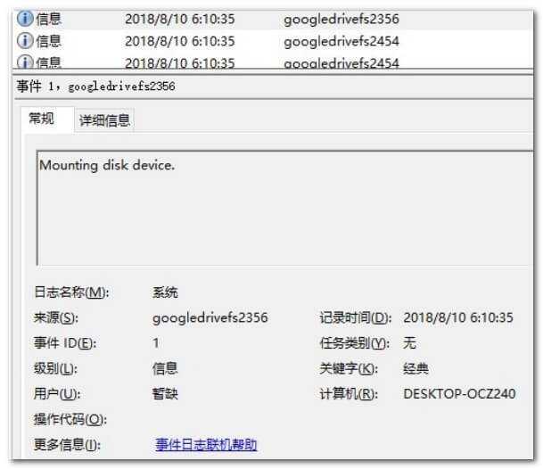 1.通过事件查看器找到触发源googledrivefs2356,常规描述:Mounting disk device.