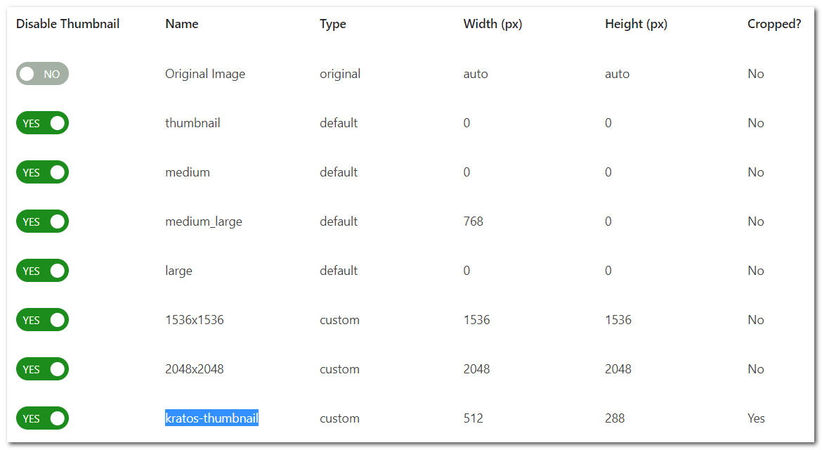 4、使用/image-sizes/插件检查,判断512x288缩略图属于“kratos-thumbnail”生成,说明插件无法禁止这部分缩略图: