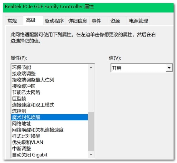 此时应当就可以网络唤醒,如果仍然无法网络唤醒,部分网卡驱动可能需要额外在“高级”中开启有关“唤醒”的设置,逐一尝试: