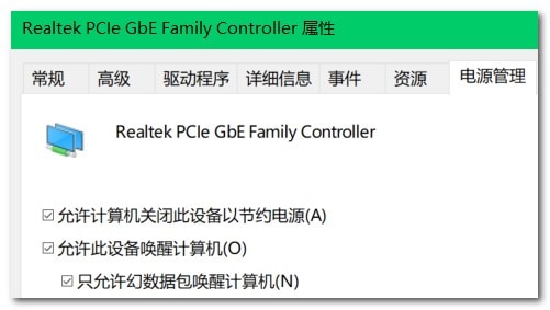 3.2 在Windwos-设备管理器-有线网卡-电源管理中,勾选“允许此设备唤醒计算机”、“只允许数据包唤醒计算机”: