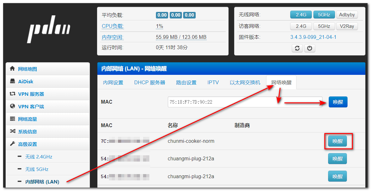 4.2 进入路由器(Padavan)页面,【高级设置】-【内部网络(LAN)】-【网络唤醒】,在MAC框输入需要网络唤醒电脑的MAC地址,点击“唤醒”按钮,此时关闭的笔记本电脑将会开机: